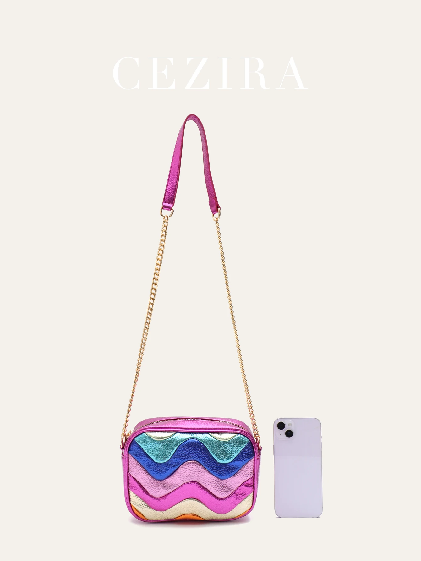 CEZIRA Women Brand Design Luxury PU Vegan Leather Colorful Stripes Wave Patchwork Cross body Bag Square Zip Shoulder Purse Daily