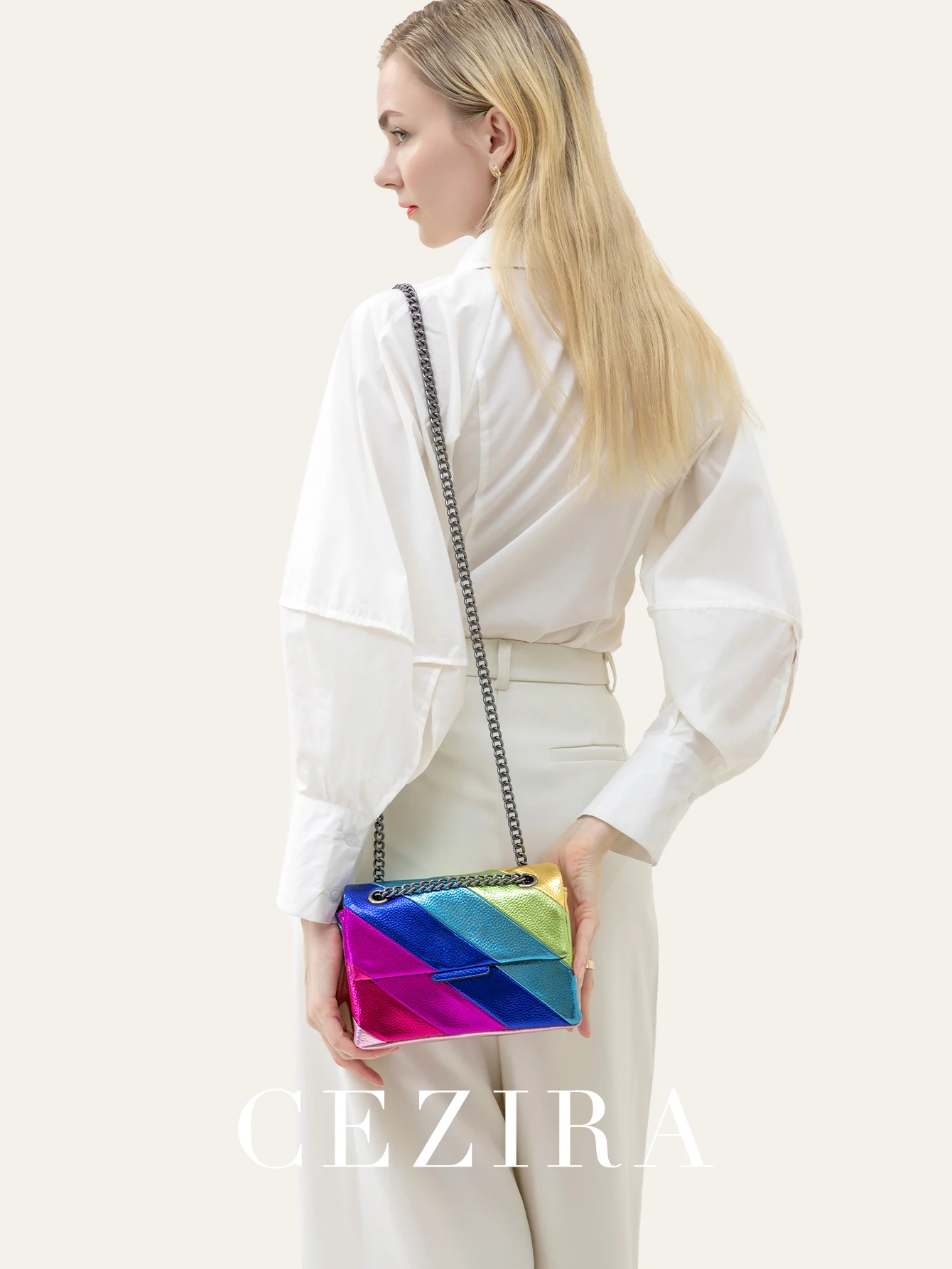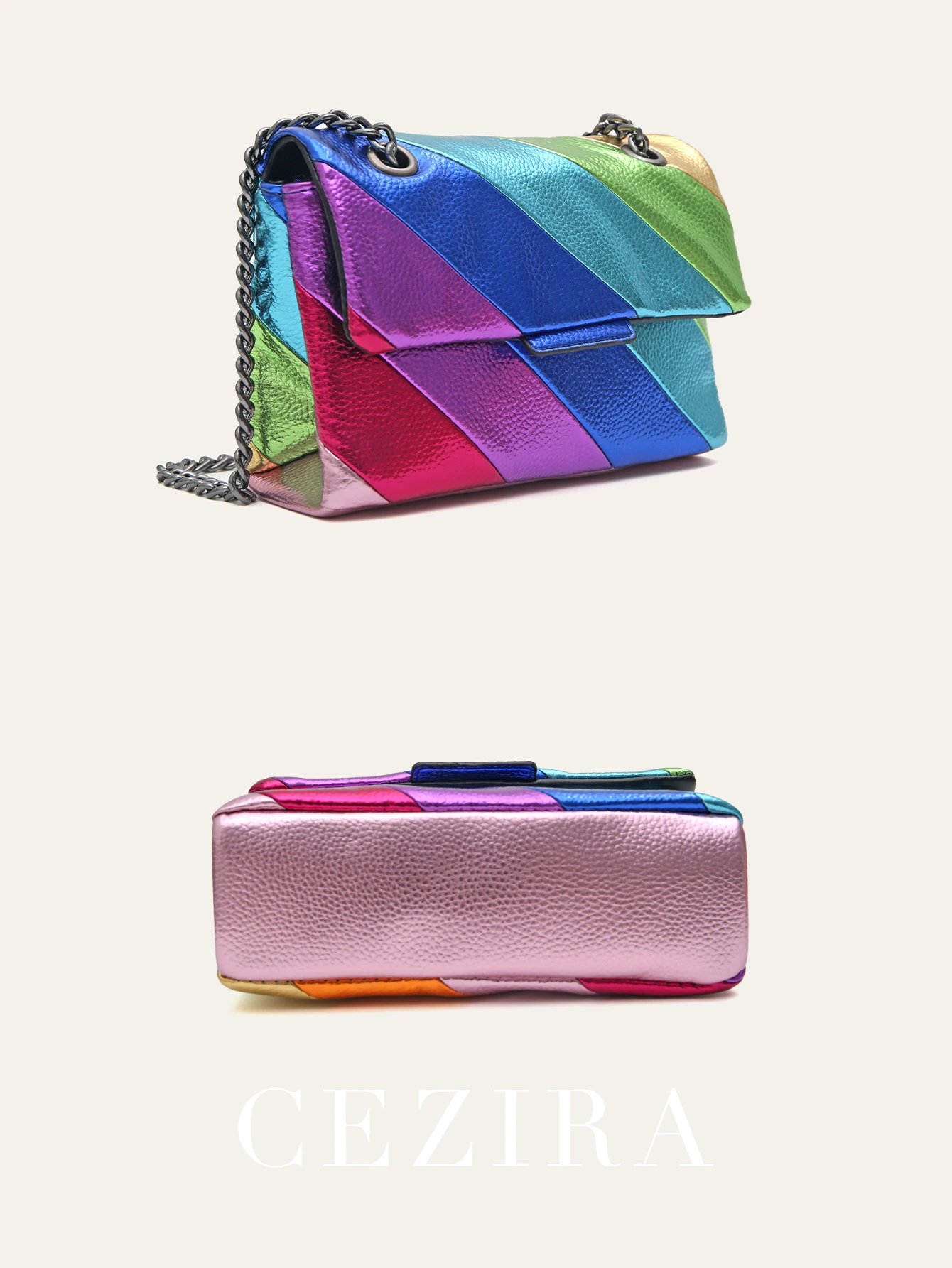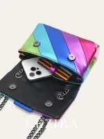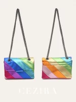 CEZIRA Women Fashion Metallic Rainbow Color Stripes PU Vegan Leather Bag Small Square Magnet Flap Cover Metal Chain Cross body