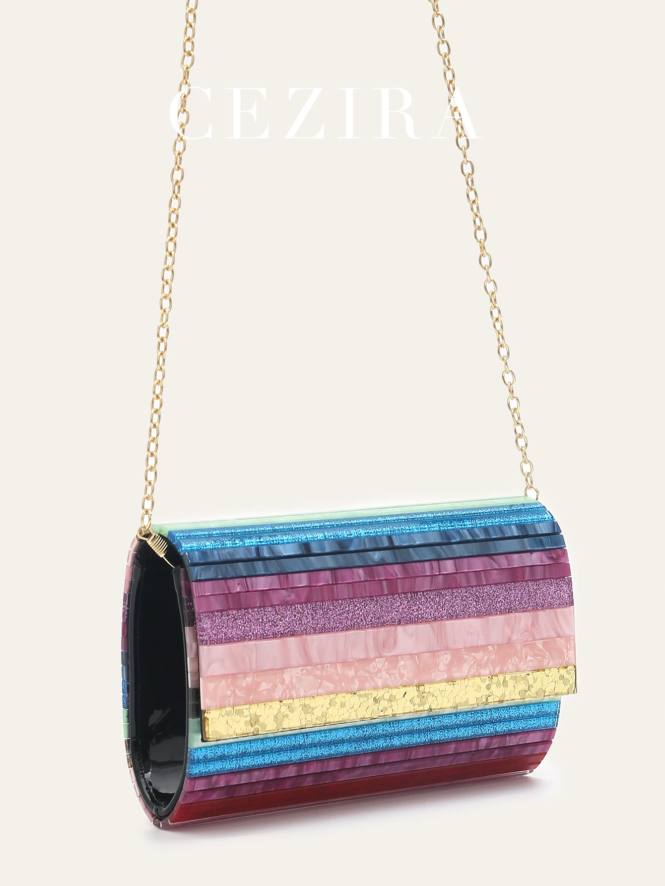 CEZIRA Women’s Niche Design Colorful Striped Acrylic Clutch Handbag Flap Cover Charming Evening Bag Long Chain Fashion Purse