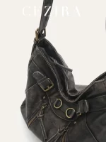 CR Vintage Casual Soft Washed PU Vegan Leather Shoulder Bag Adjustable Handle Strap Cross body Handbag Cool Street Style Hobo
